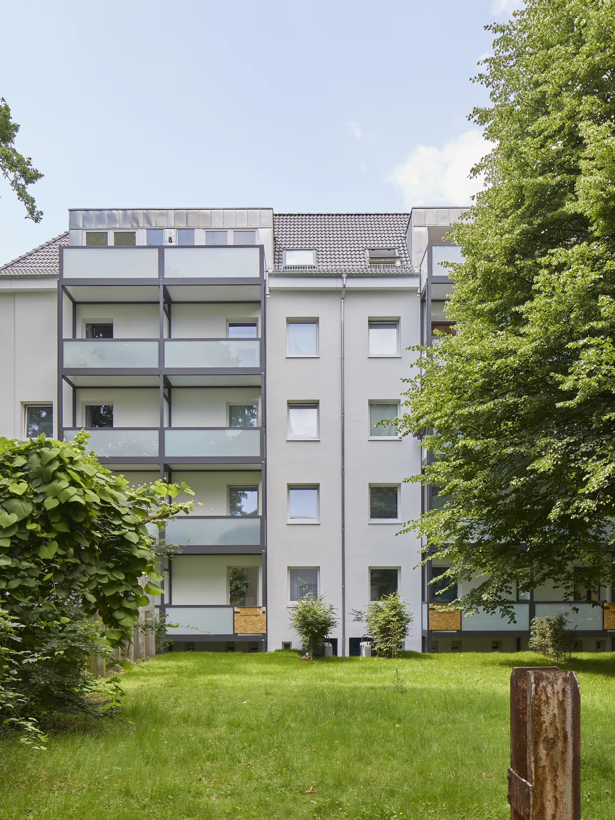 Babic C. Tekeolgou’s office got a commission to refurbish three blocks of flats – each with 16 staircases – from the 30's in the northern outskirts of Hamburg. The buildings’ roofs were destroyed during WW2, in the course of makeshift repairs few apartments were added under the roof to provide living space in the carpet–bombed town. The task was to design mid-range rental apartments in the attic, as well as refurbish the floors below. In each block of flats, twelve 75 sqm apartments and eight studios of half the size were added..
