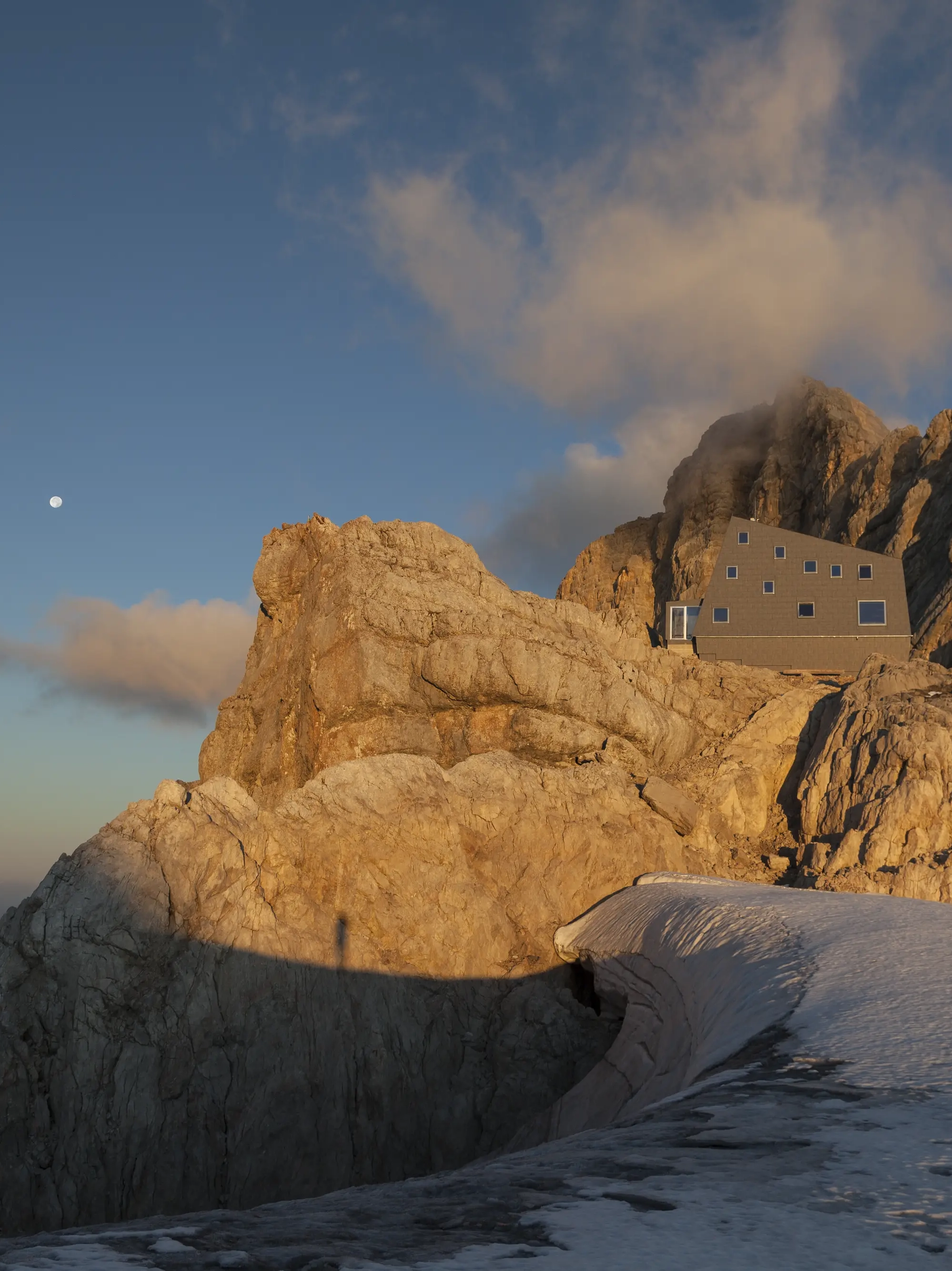 The building changes its colour in the same way as the rocky landscape, in which it stands: golden in the morning, becomes light grey in the midday sun, shines at sunset to fade into a deep blue and black after dusk. The main entrance is on the ground floor, as well as the kitchen and dining area. Two upper floors, accessible only in the afternoon, are bedrooms and private flat of the innkeepers. Every little detail is thought through for maximal functionality and all the comfort needed in alpine conditions.