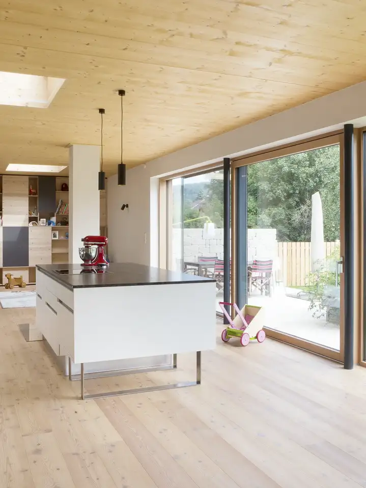From the very start, managing the light was a part of the design process for the architects of Baukooperative. The idea was to have the natural light highlight the wood in the living room for a warm and inviting feel. "We used VELUX Daylight Visualizers to help us plan it all out. With the help of the VELUX visualisations, we were able to identify differences in the positioning of daylight sources during the planning process to be sure everything was perfectly positioned." The family ultimately chose to place a flat roof window in a tucked away corner of the extension as well as in the kitchen area.