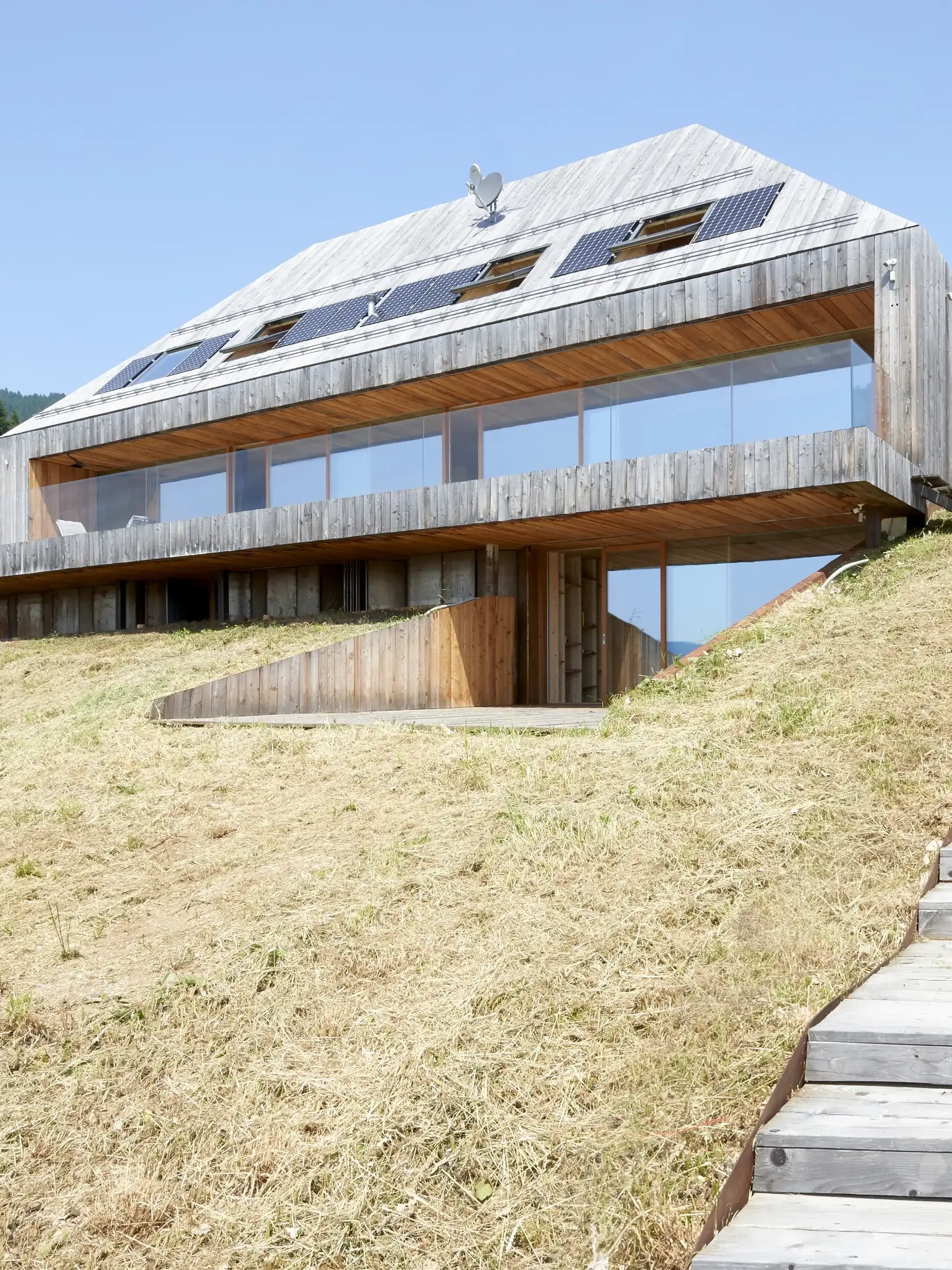 The architects' extensive research on reinterpreting traditional architecture resulted in a rectangular volume with a sloped roof, clad in raw larch boards and stripped of unnecessary retro–decorations. The interior did not follow the traditional typology, as the desired room sizes and the relation to the outside in a modern holiday house has changed since the old days. The need for protection against the weather conditions only belongs to the past. The clients' wish for living in the landscape – and in the sun – reflects the contemporary attitude towards nature.