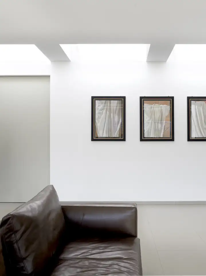 The coexistence of overhead and vertical windows in the same space enables the occupants to notice variations in light over the course of the day. The flat roof windows were placed some distance away from the vertical ones, to add multi-directionality and balance to the field of vision, bringing brightness to the wall and highlighting the movement of the light.