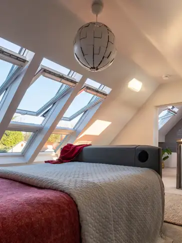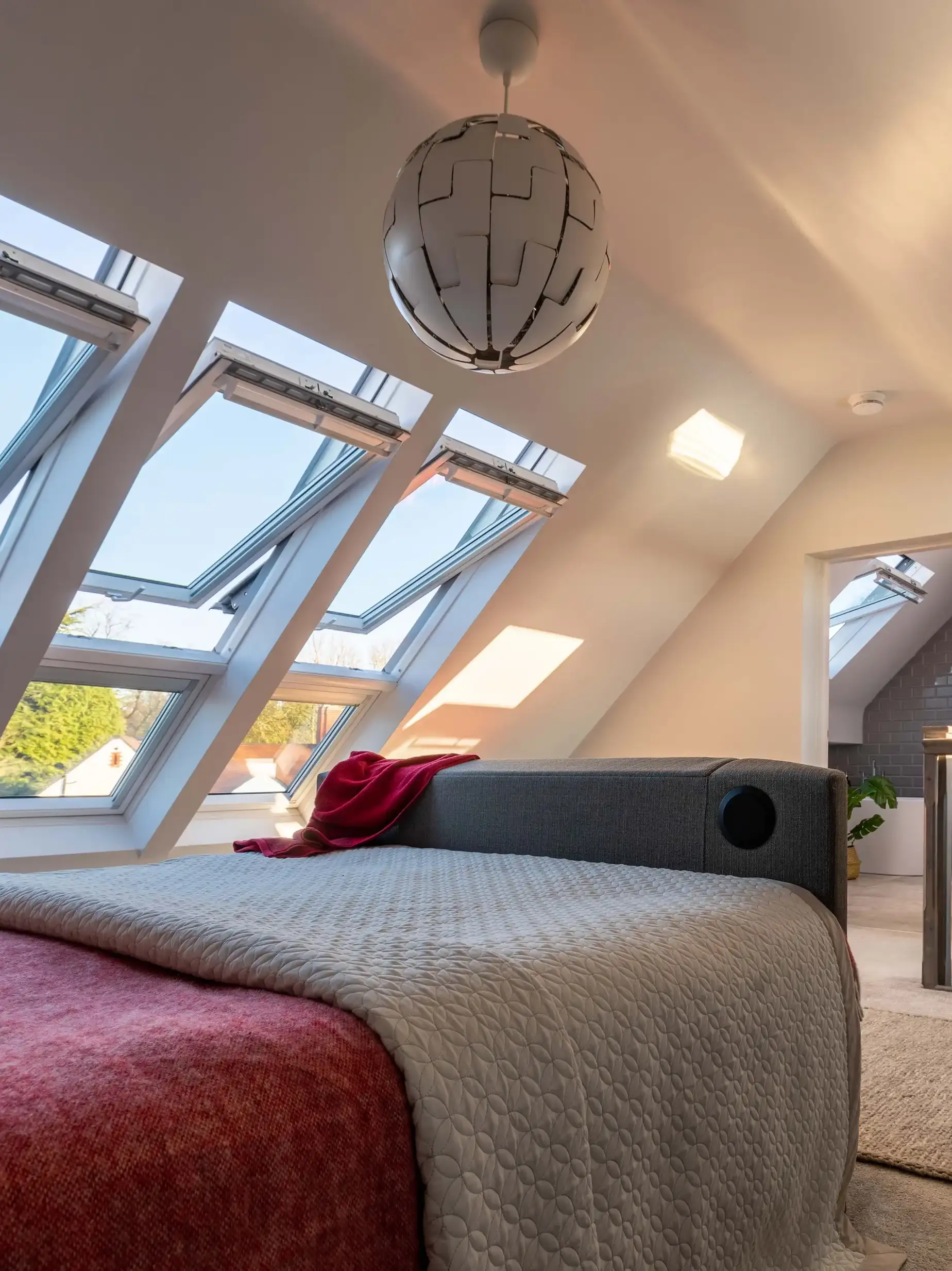 When it came to choosing the roof windows there were certain must-haves. "With three young children in the house, safety was at the top of our priority list", says Sarah. Design A Loft created three openings along the roof pitch and fitted VELUX units in place; three fixed units on the bottom row, with three top-hung roof windows above.