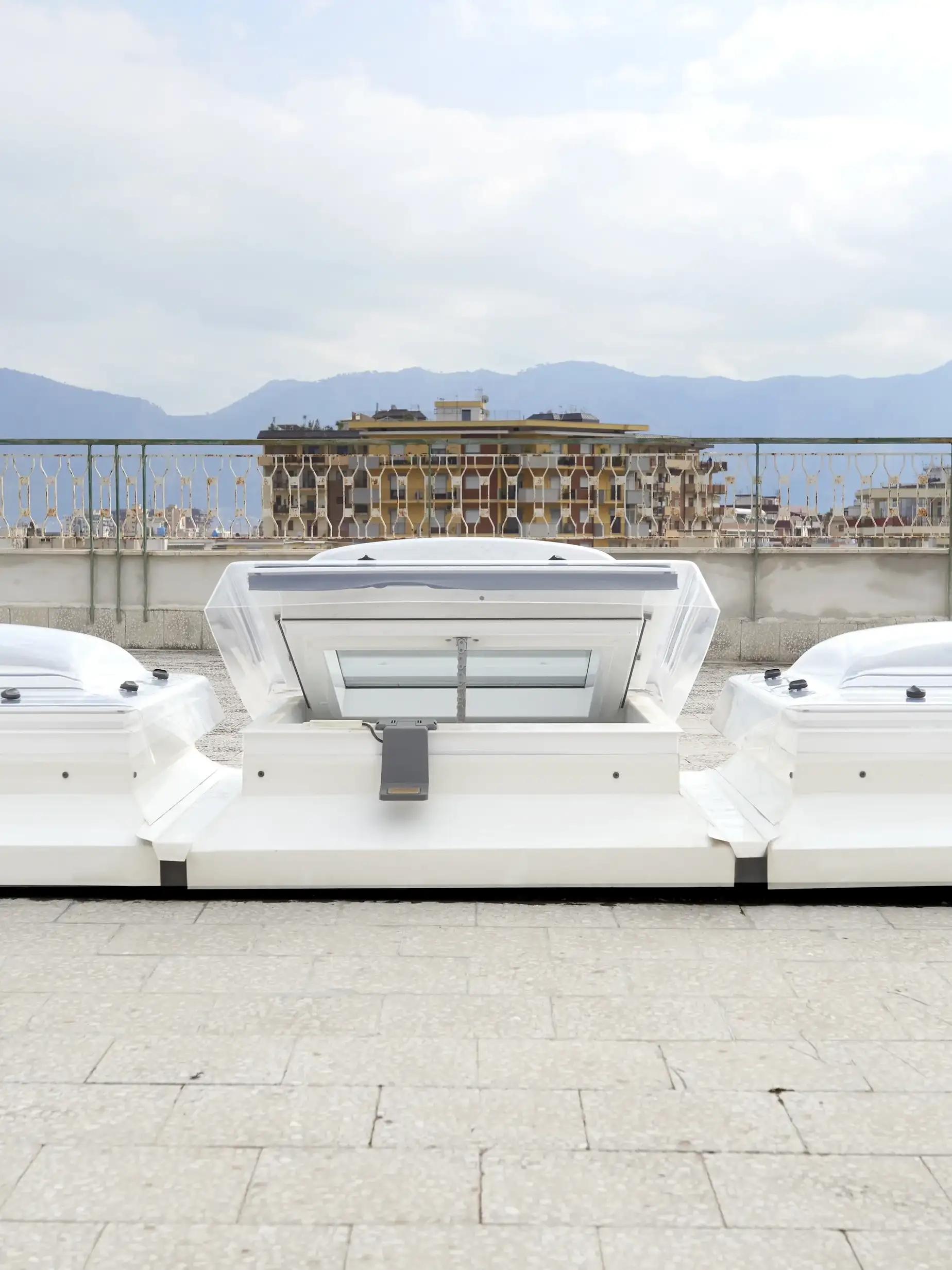 In the spaces created in the central section of the apartment, which were underutilised as they were designed only for circulation, the regulations stating that windows should cover an area one-eighth of the floor space were circumvented by the addition of large overhead windows.