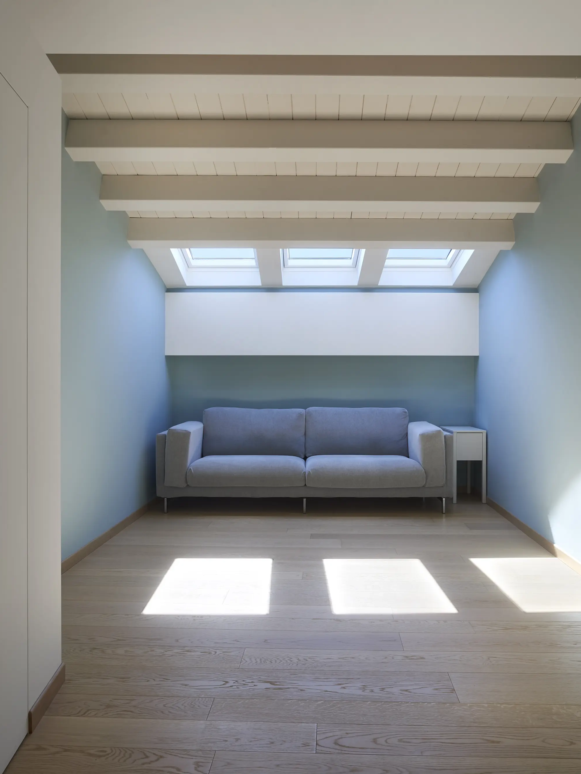 By placing the roof windows side by side, strips of light were created in the lower part of the roof pitch, bringing pleasing light effects and emphasizing the movement of light during the day.
