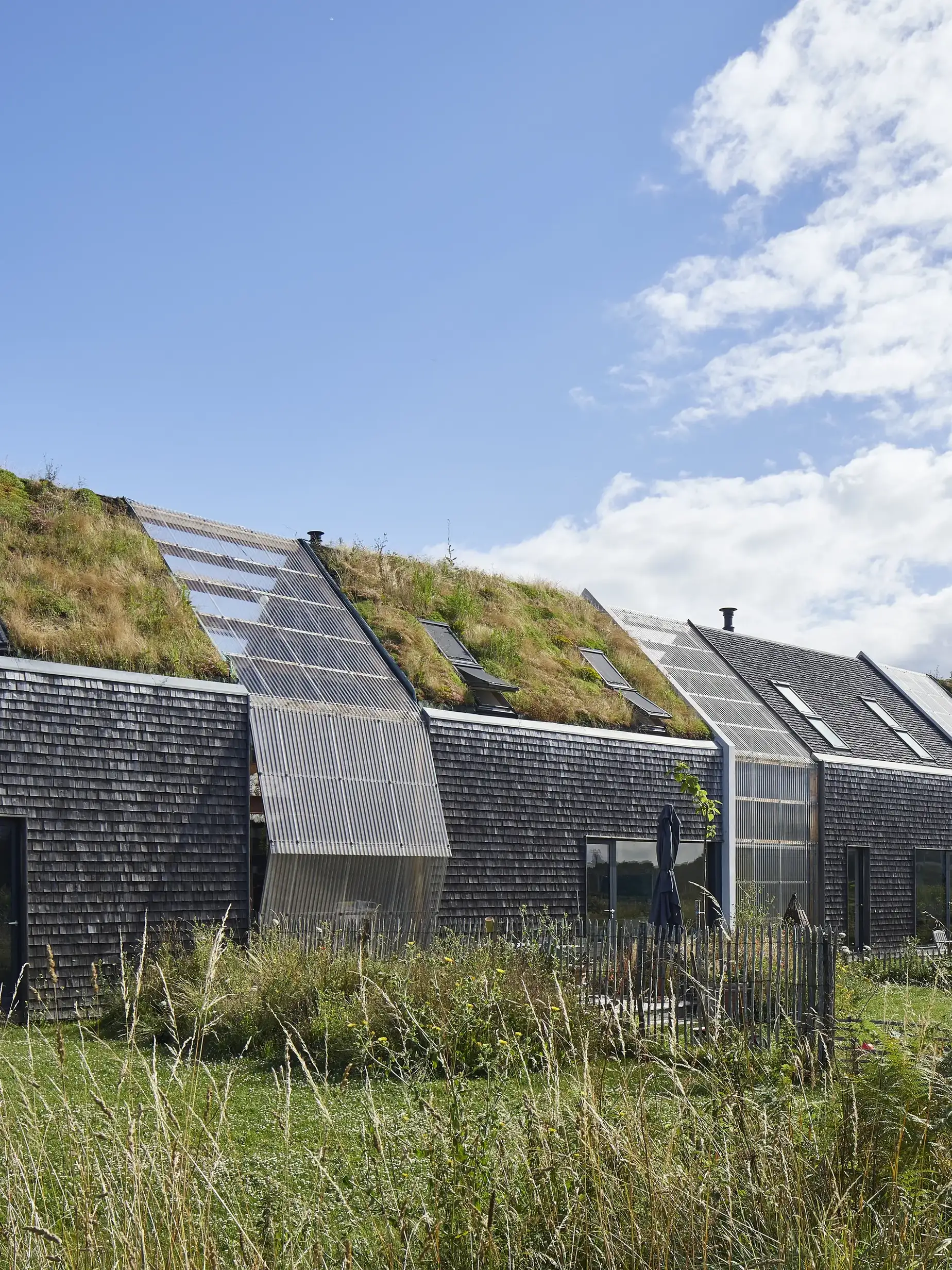 Recycling or using biodegradable resources is a rule in the entire house: straw and hemp were used for insulation, collected rainwater irrigates the greenhouses, wooden shingles of the facade left untreated.