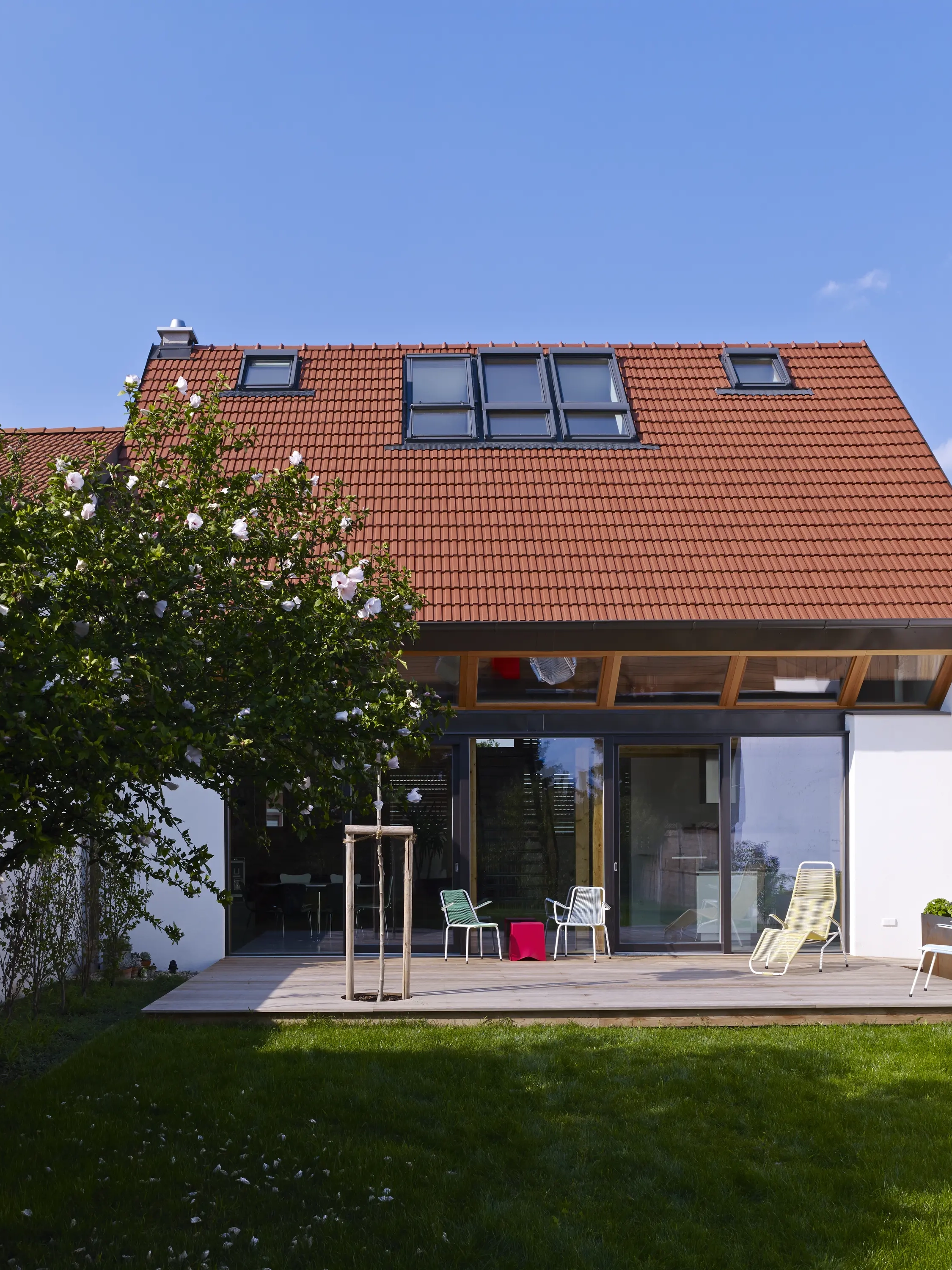 Guided by the principle of “simple, timeless and vibrant”, a permanent home was created, with its qualities gained through omission. As the building deliberately opens up towards the garden, the interior and exterior space could be successfully interlaced. The neighbouring building acts as protection against wind, prying eyes and noise.